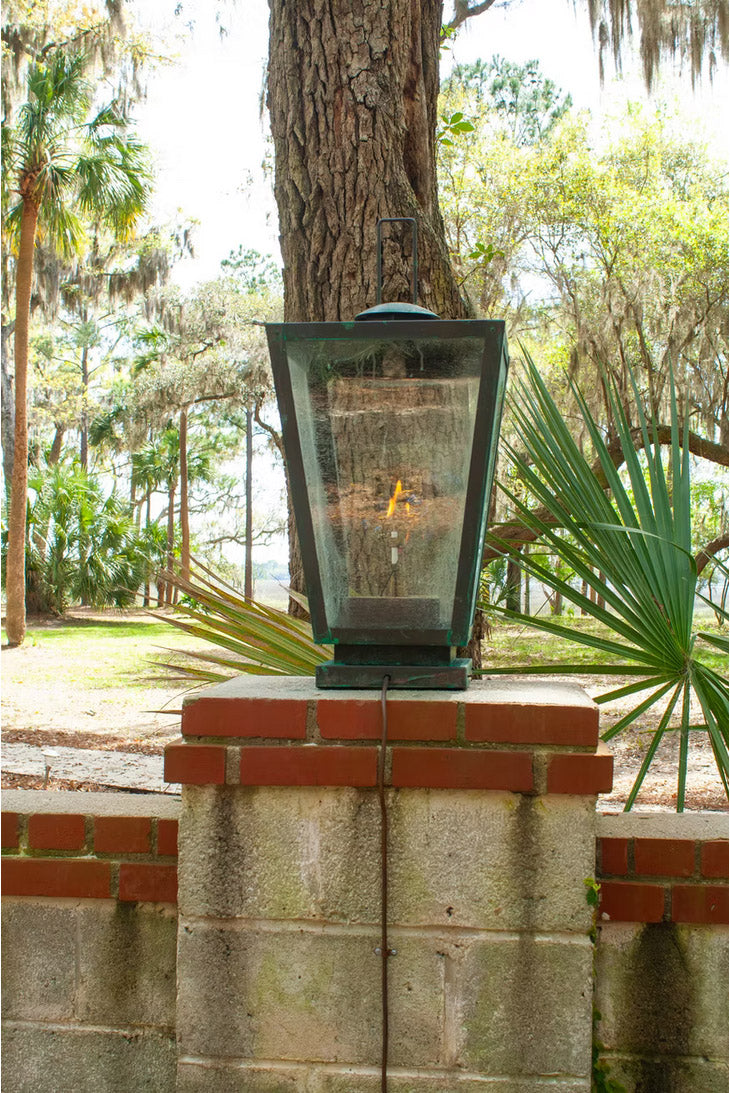Refined and rugged, the Equestrian Copper Lantern captures the spirit of classic outdoor living with a bold, elegant profile. Expertly handcrafted from solid copper, this lantern features a tall, tapered silhouette suspended from a striking steel bracket offering both visual drama and structural stability. Its clean lines and exposed flame (or Edison-style or candelabra bulbs in electric models) create a warm, inviting glow that enhances entryways, stables, patios, or rustic architecture. Designed for versatility, the Equestrian is available in gas or electric configurations and a variety of mounting options to suit your space. Over time, the copper finish naturally patinas, adding depth and timeless character to this distinctive fixture.