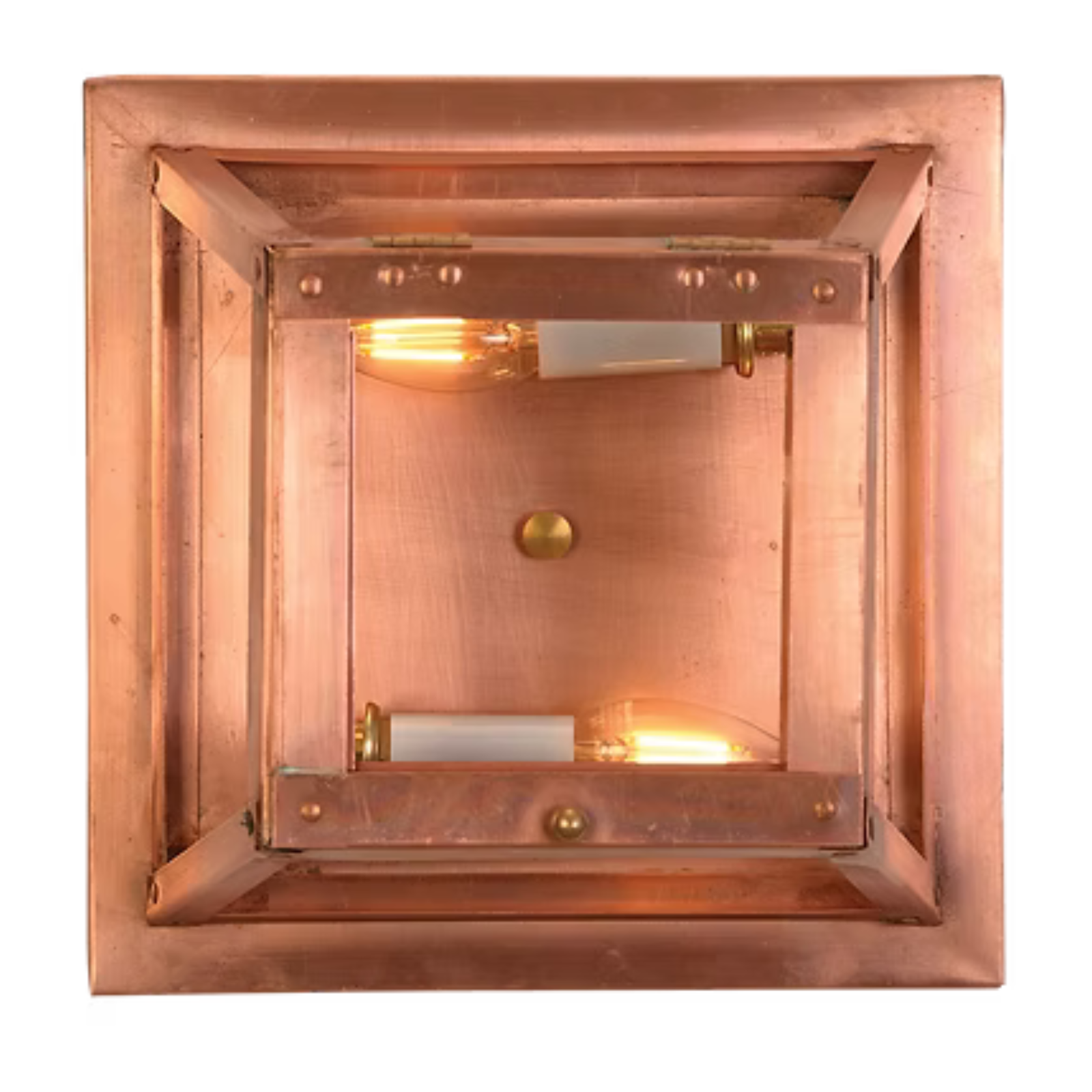 Hand-crafted from solid copper, the sconce features warm, natural tones that will patina beautifully over time. Its simple geometry highlights the glow of exposed vintage-style bulbs, creating an inviting ambience that blends seamlessly with rustic, modern, or traditional decor. Durable brass accents complete the look, making this piece both timeless and versatile.